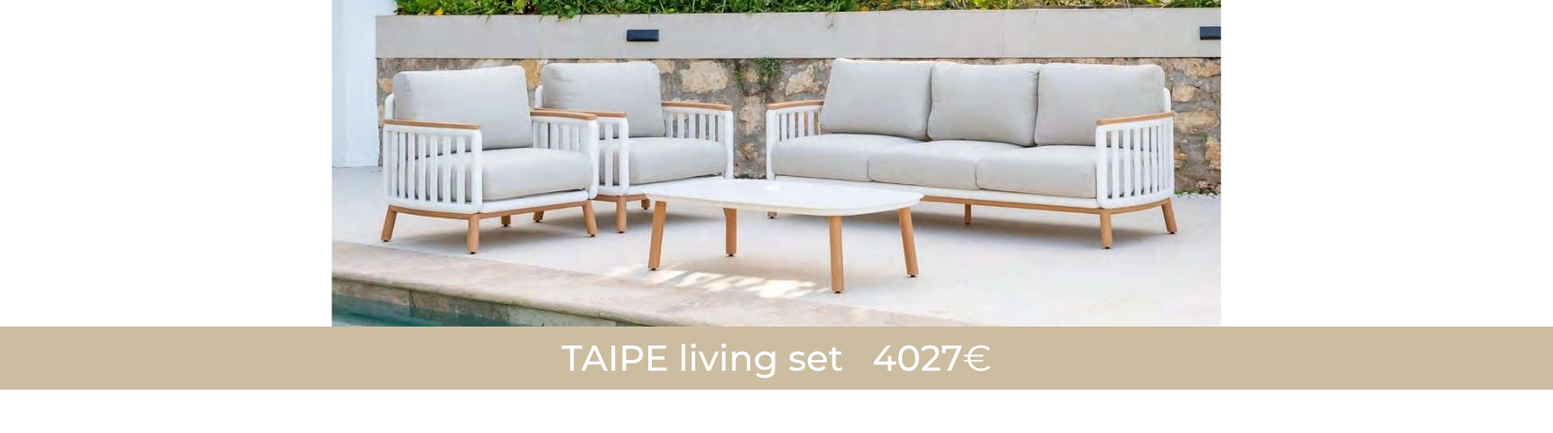 Aluminum set available in white, combining elegance and durability. The armrests and legs feature an aluminum wood-like finish, adding a natural and sophisticated touch. The beige cushions provide comfort and refinement, making this set the perfect choice for any outdoor space.