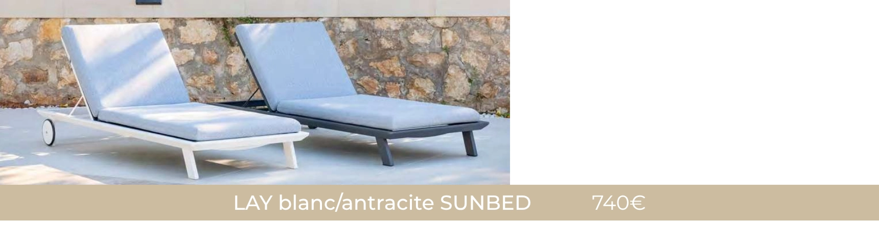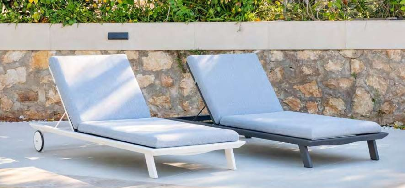 The Lay blanc/antracite sun lounger is available in white or anthracite aluminium, it suits various decor styles. The 8 cm thick olefin upholstery in grey ensures comfort and weather resistance, and it is removable for easy cleaning. Equipped with rear wheels, it allows for effortless movement. Perfect for gardens, terraces, and poolside areas.