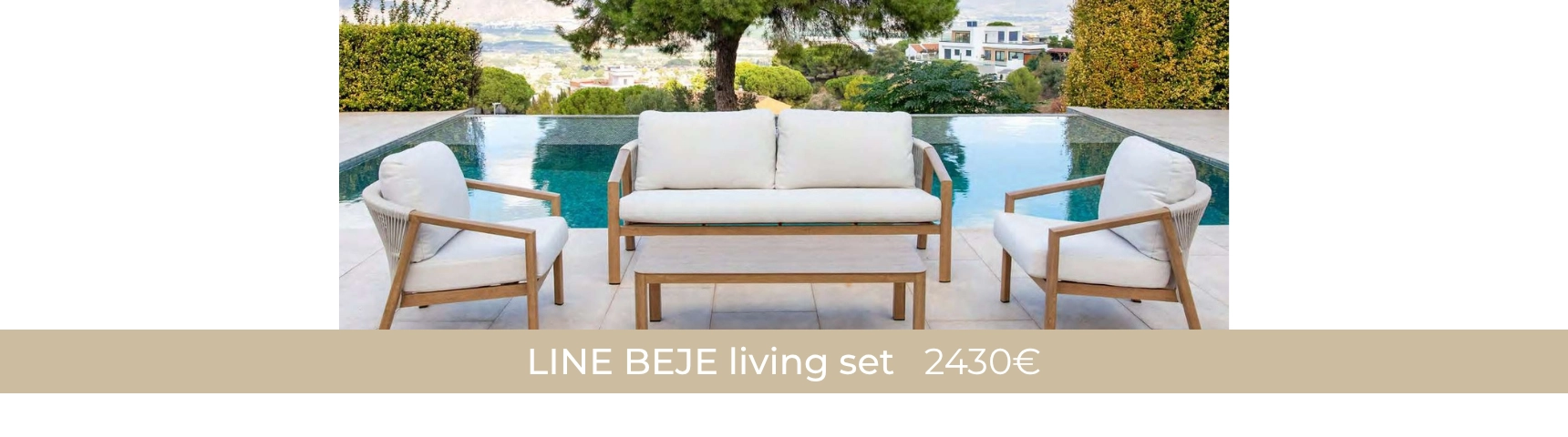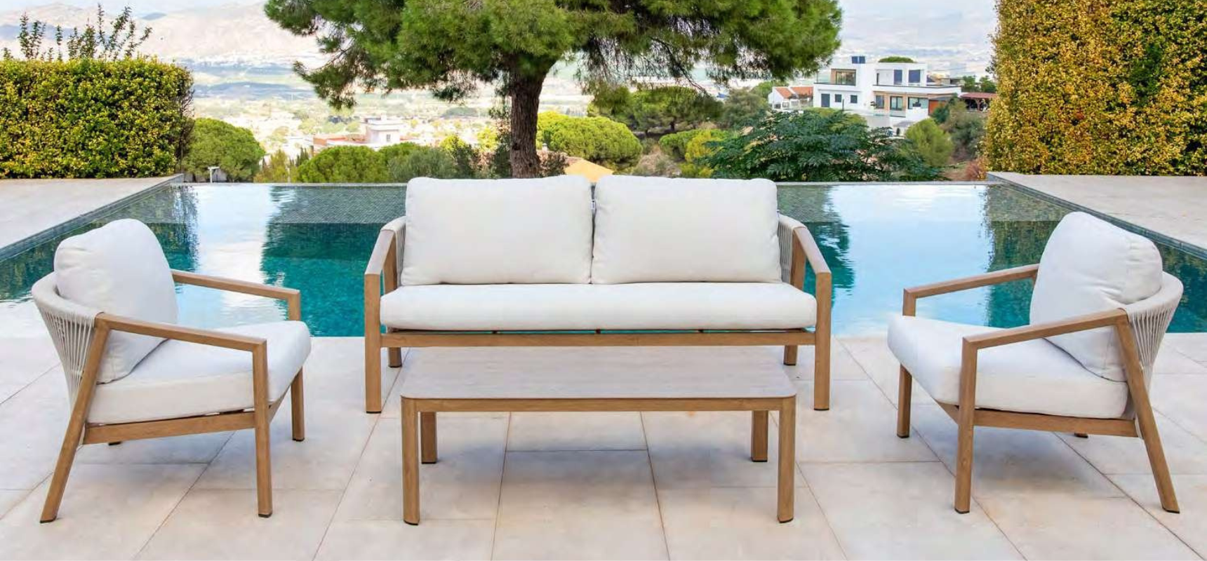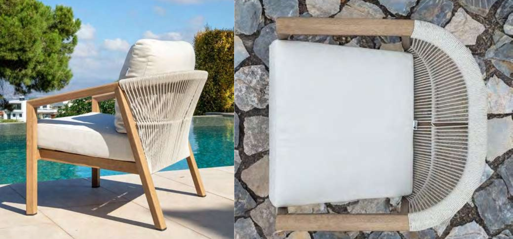 This elegant set combines the lightness and durability of aluminum with the charm of wood, creating a sophisticated and long-lasting design. The synthetic rope backrest adds a contemporary touch, while the 12 cm beige olefin cushions ensure maximum comfort. The table completes the set with an aluminum top that mimics wood, blending functionality and style for any outdoor space.