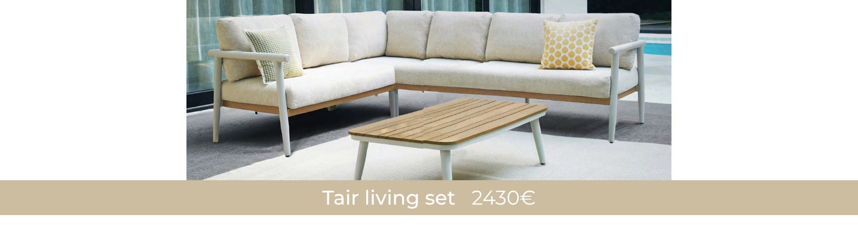Outdoor aluminum set available in taup, combining modern design and durability. The sturdy frame is complemented by wooden armrests, adding a natural and sophisticated touch. The light gray olefin cushions are comfortable, weather-resistant, and easy to maintain. The ceramic glass tabletop enhances the set with an elegant and long-lasting finish, making it the perfect choice for any outdoor space.