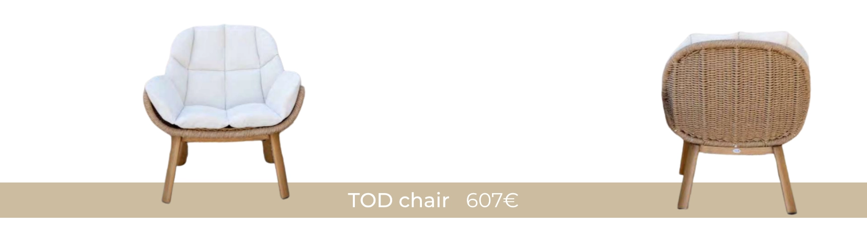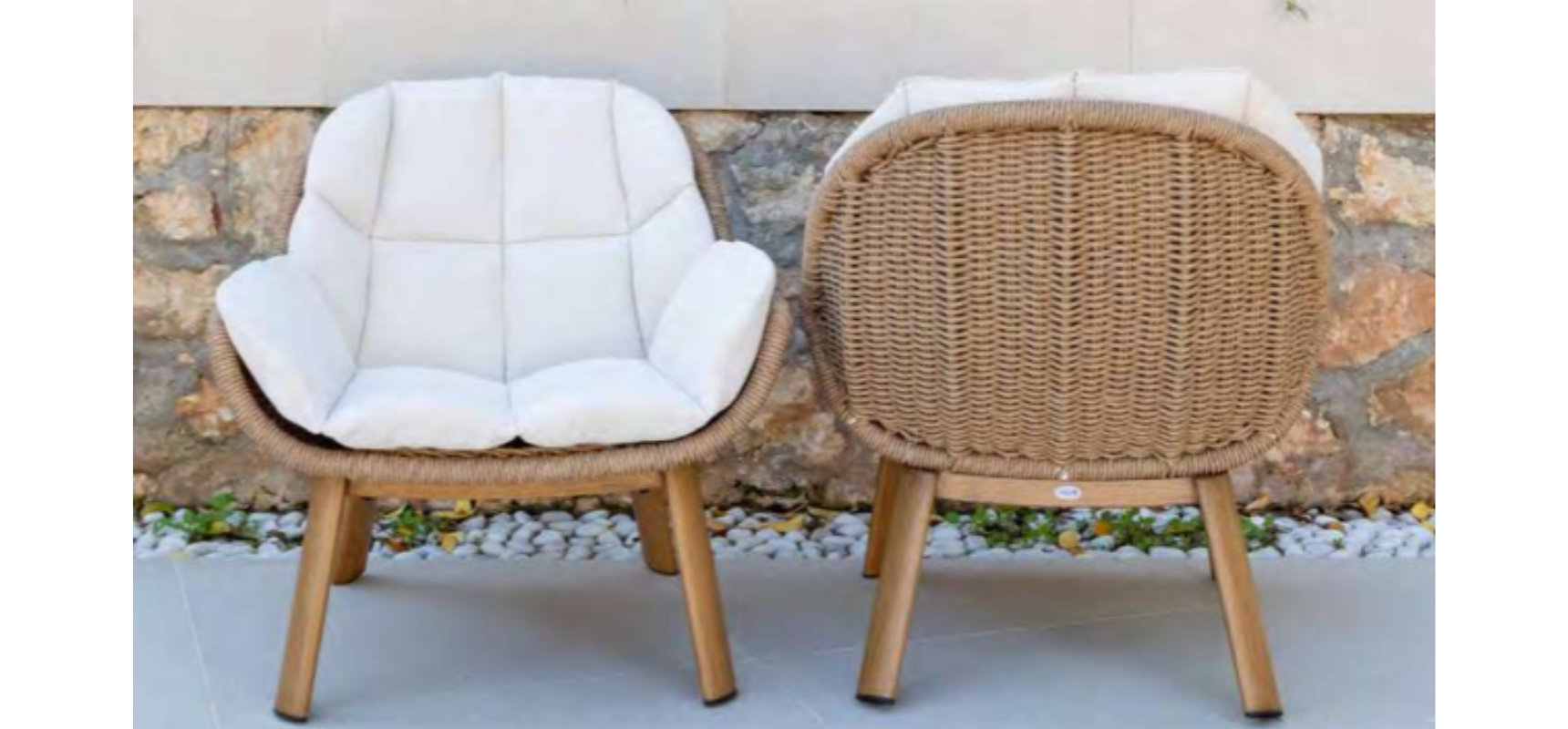Elegant and durable, this armchair features an aluminum frame with a wood-look finish. The backrest and sides are woven with natural-colored synthetic fiber, adding a handcrafted touch. Includes beige cushions for extra comfort.