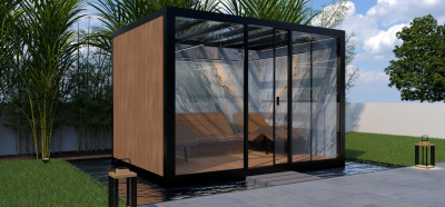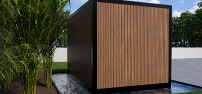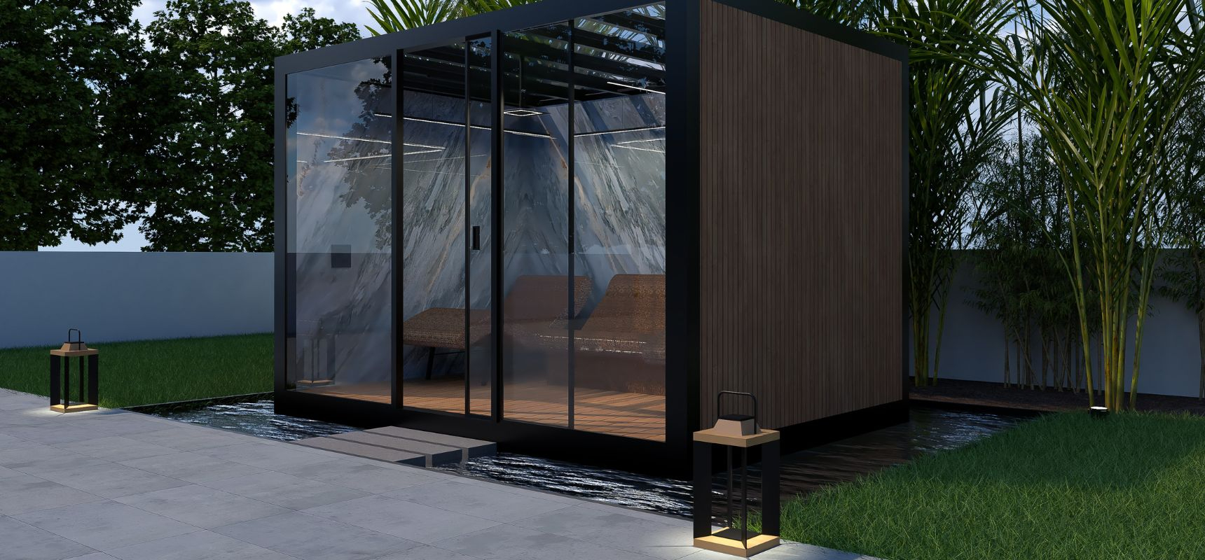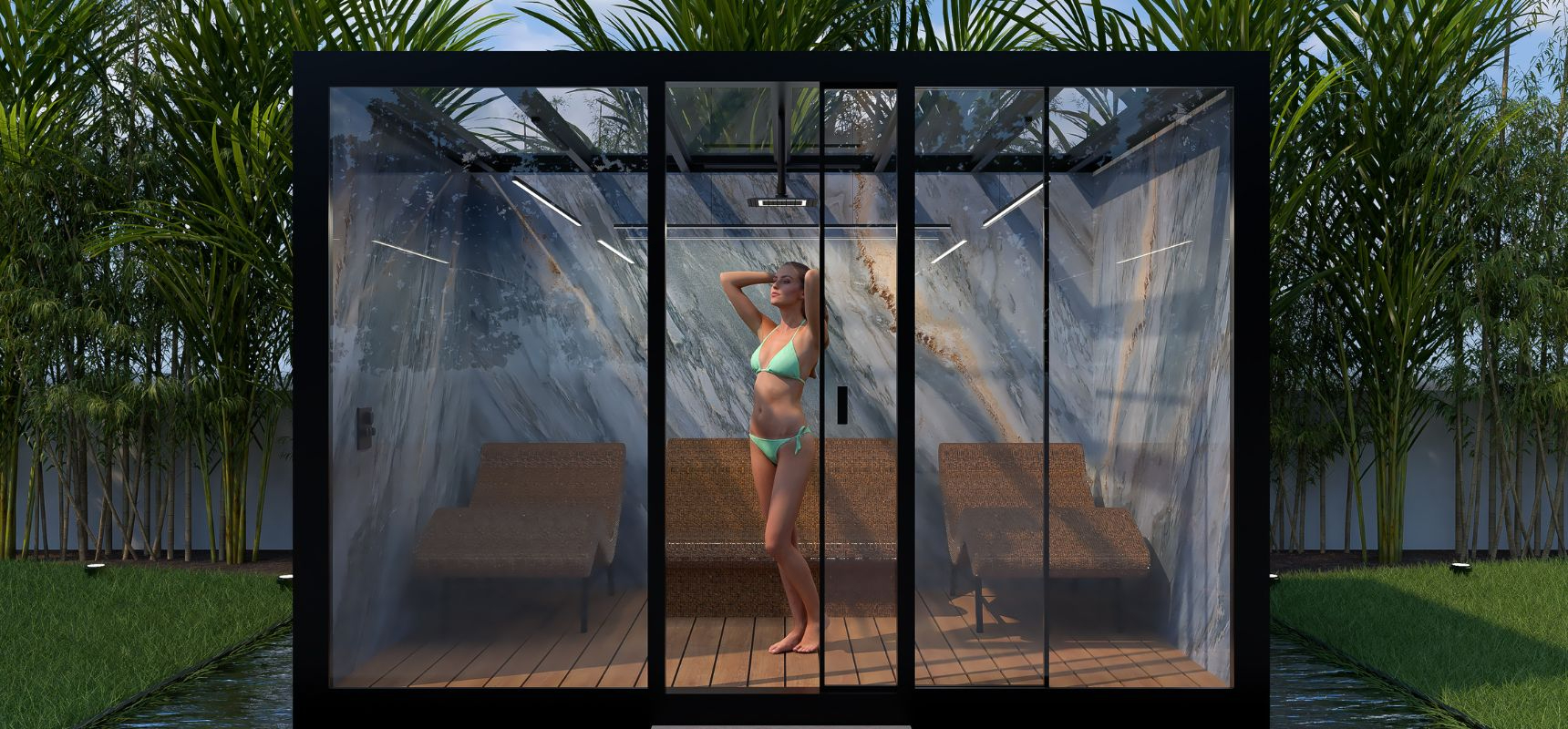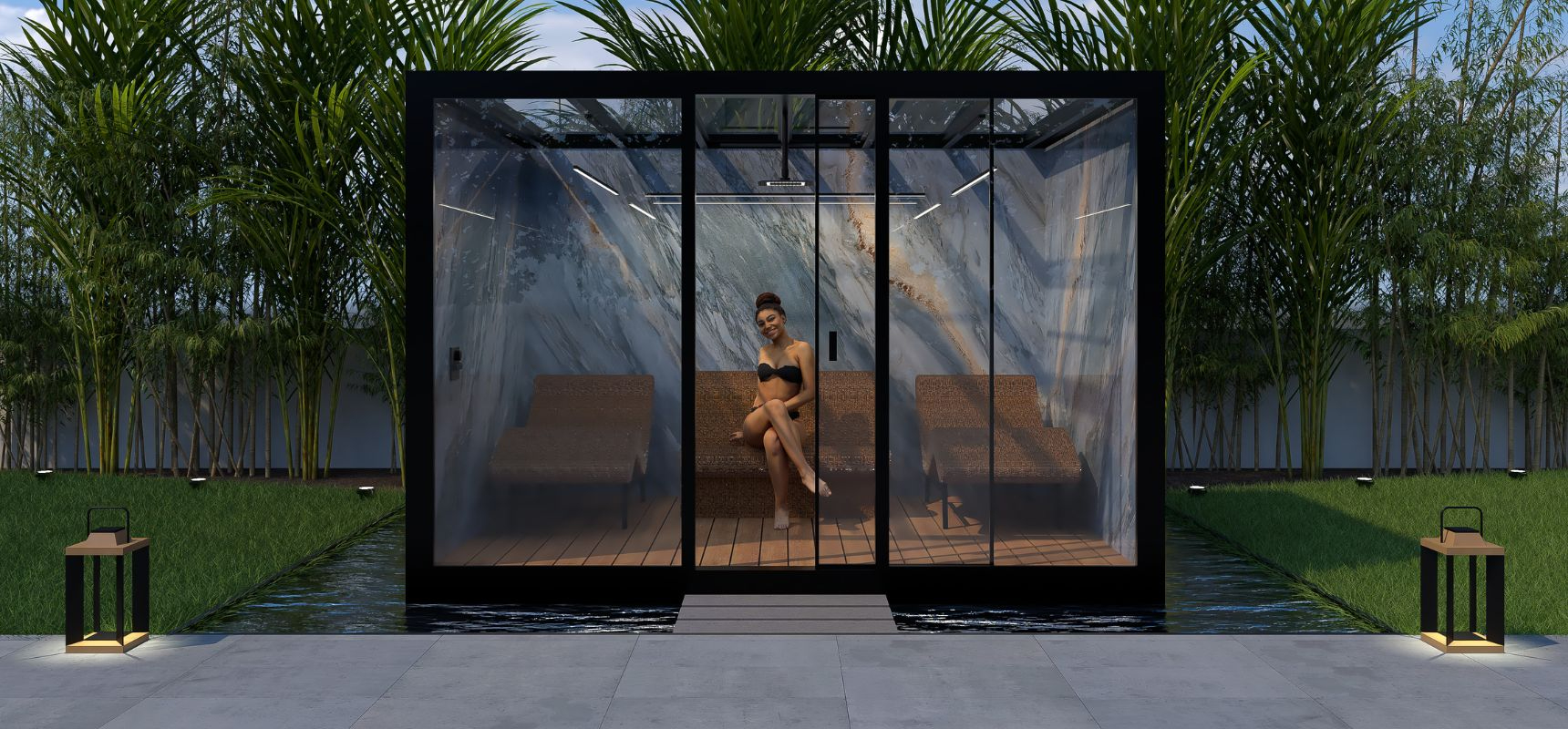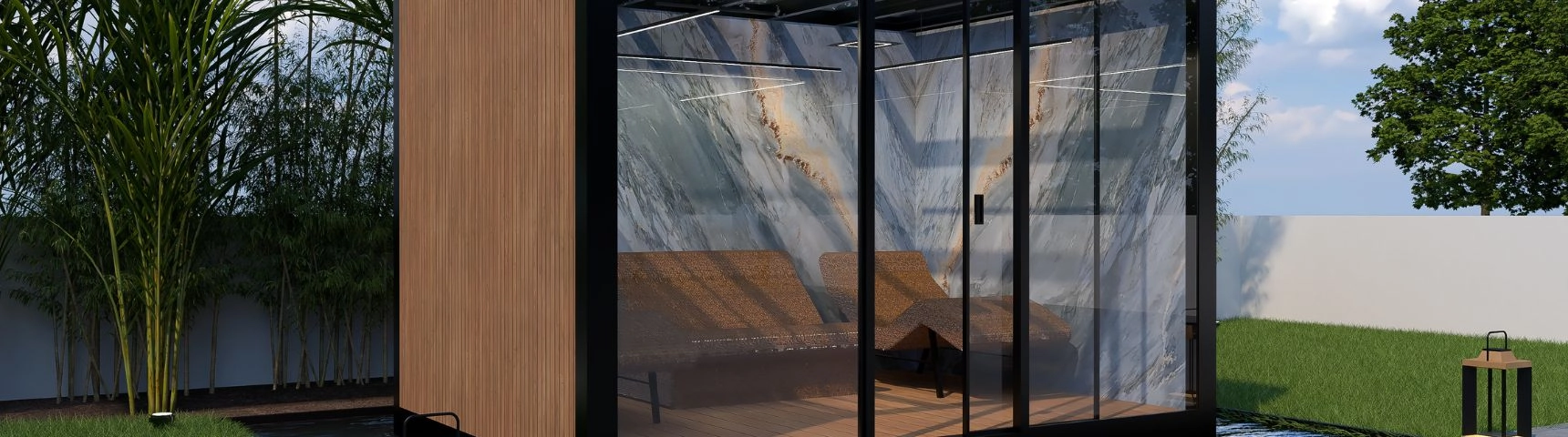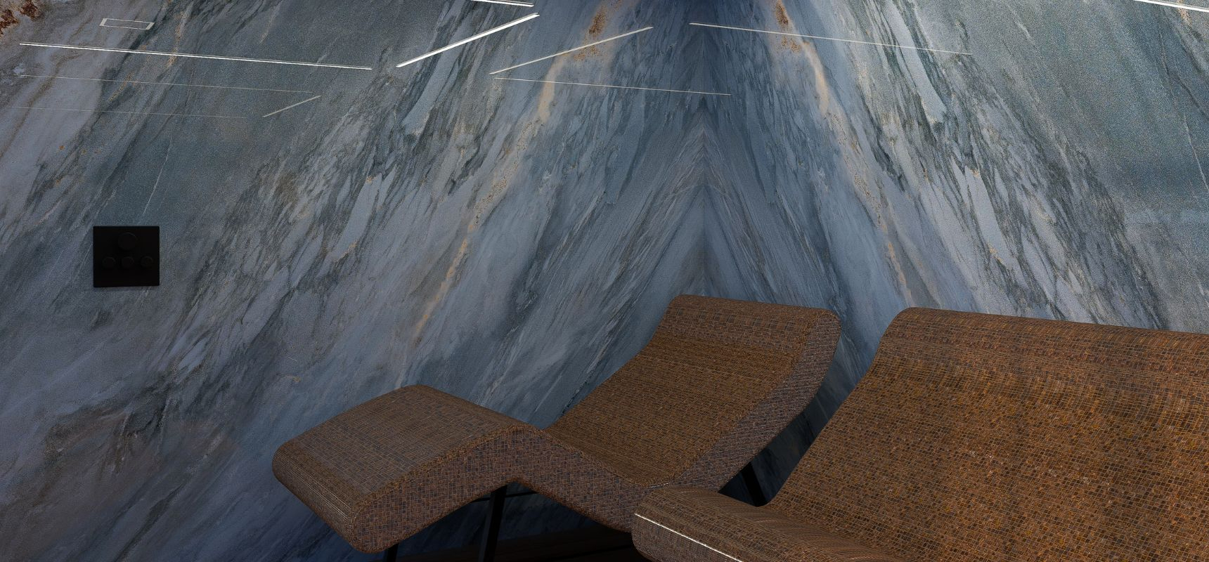 A black structure with transparent glass. The stone cladding in the stunning Palisander Blue shade envelops the sauna in an aura of natural beauty. The panels with black frames and glass on the ceiling allow natural light to enter. The interior is decorated with EPW wood panels in Titanium Castellation, while the Bisazza tile covering, from the Miscele 10 collection, adds a touch of luxury and originality. The wooden deck offers a cozy space to relax after an invigorating session in the Majestic sauna